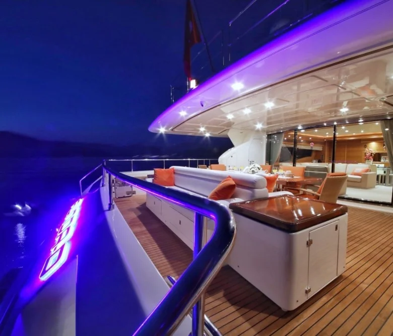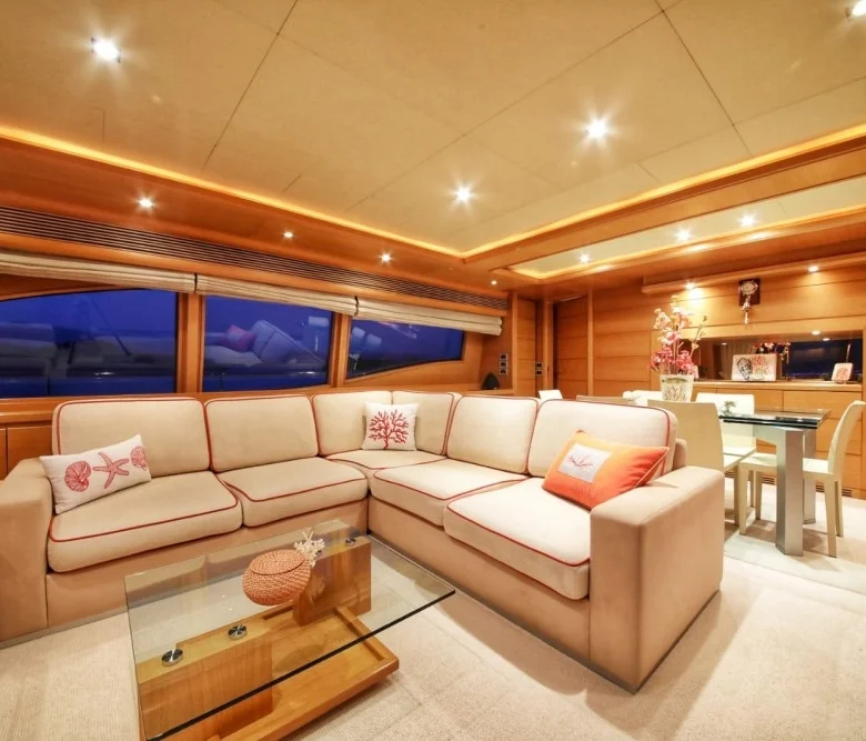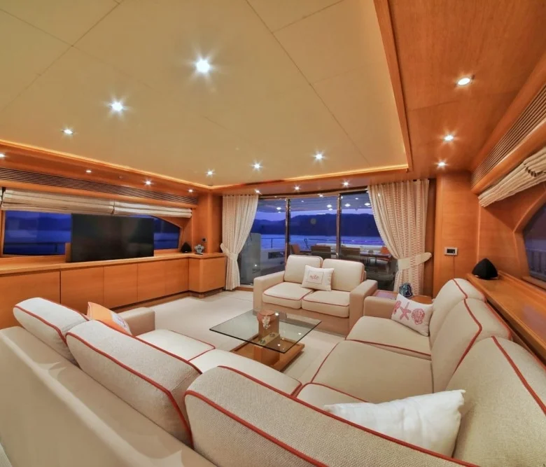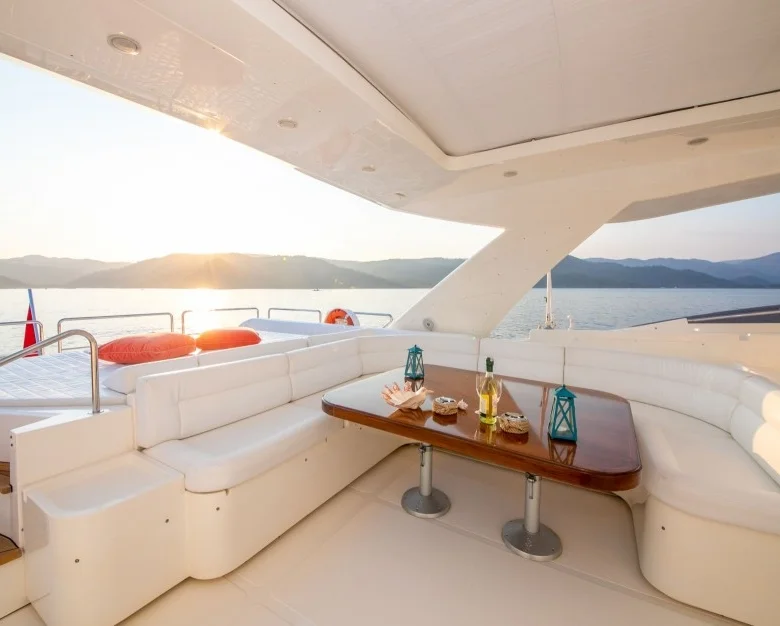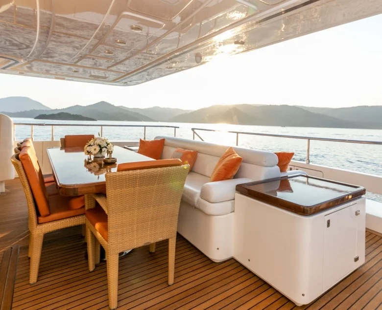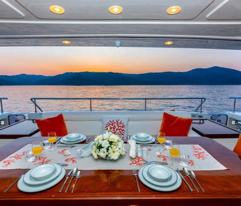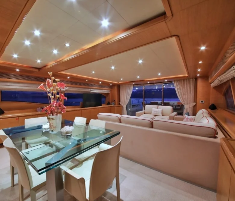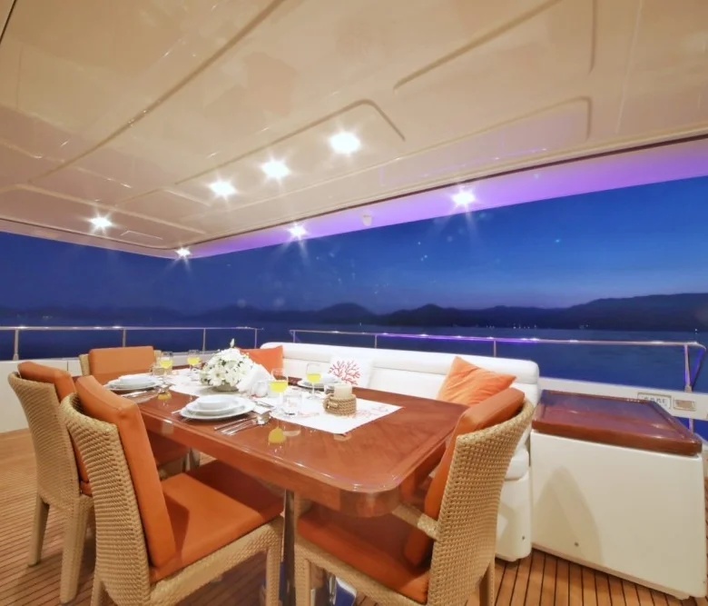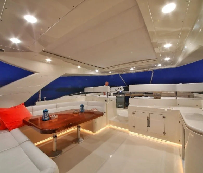 Teknede iç ve dış yemek alanları, tam donanımlı mutfak, dinlenme alanları ve Amerikan bar bulunmaktadır.