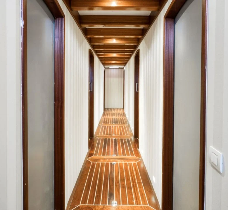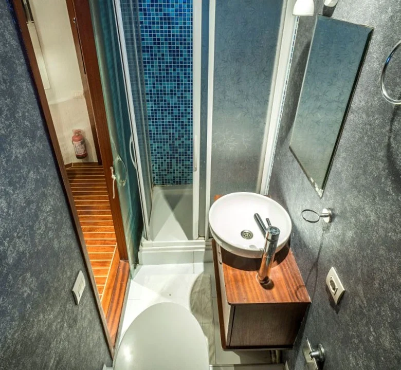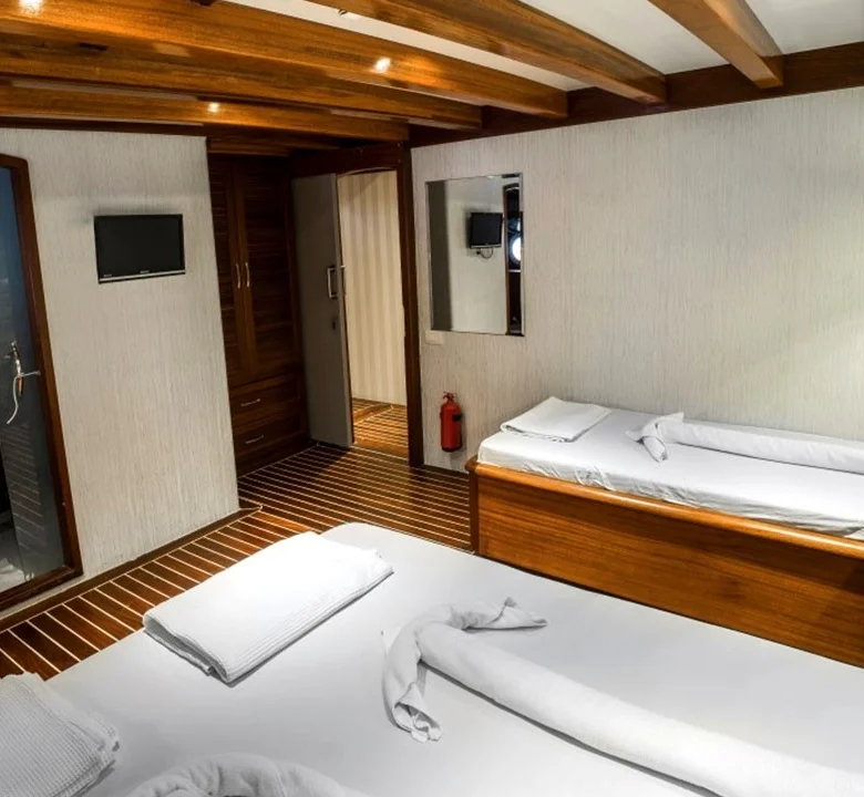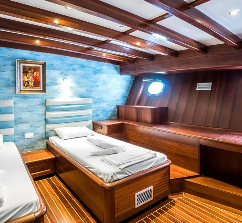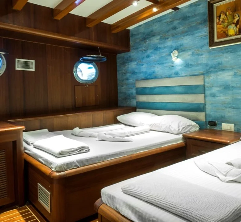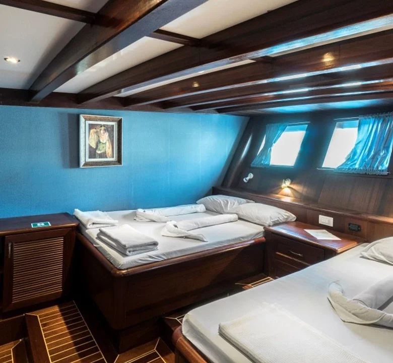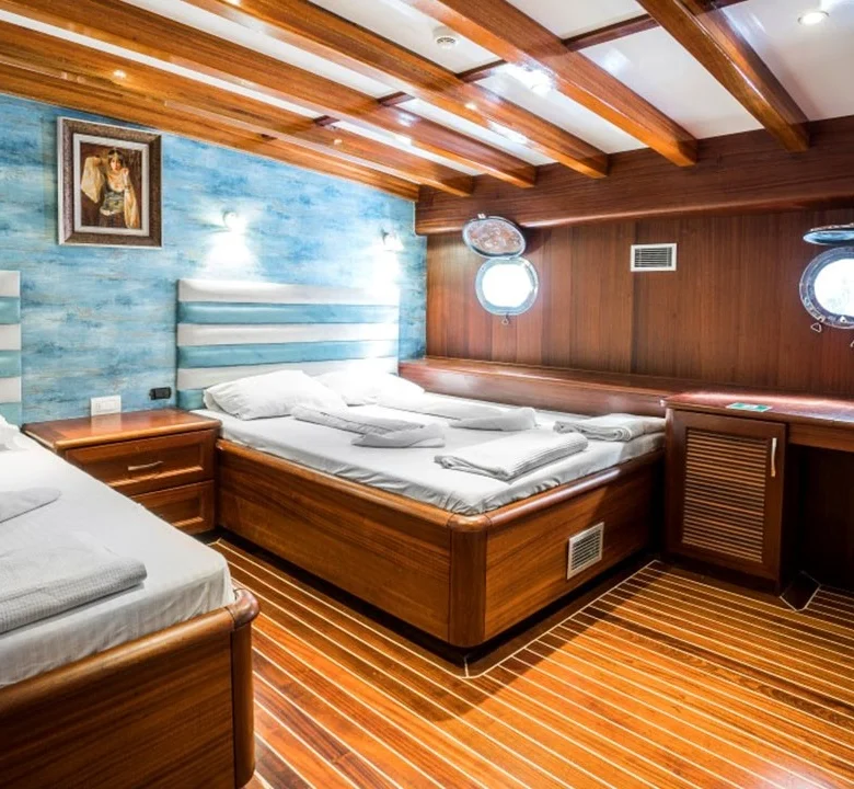 Tekne, klimalı kabinleri ve geniş ortak yaşam alanları ile kalabalık gruplara hem konforlu hem de kullanışlı bir tatil ortamı sunar.