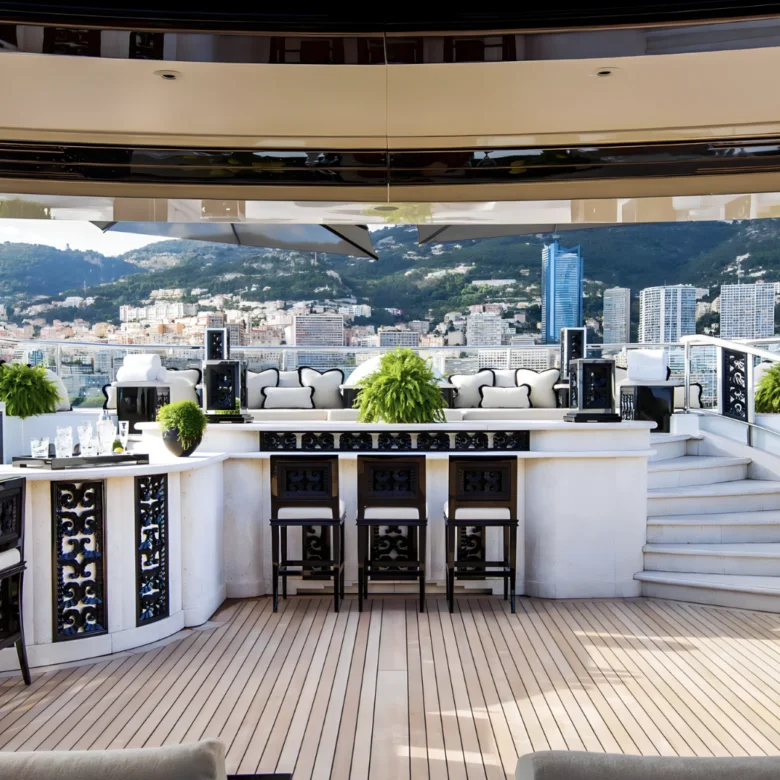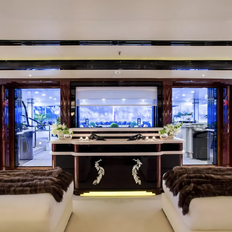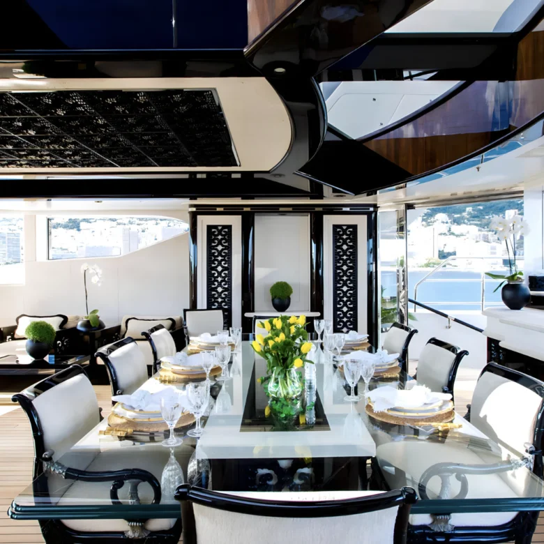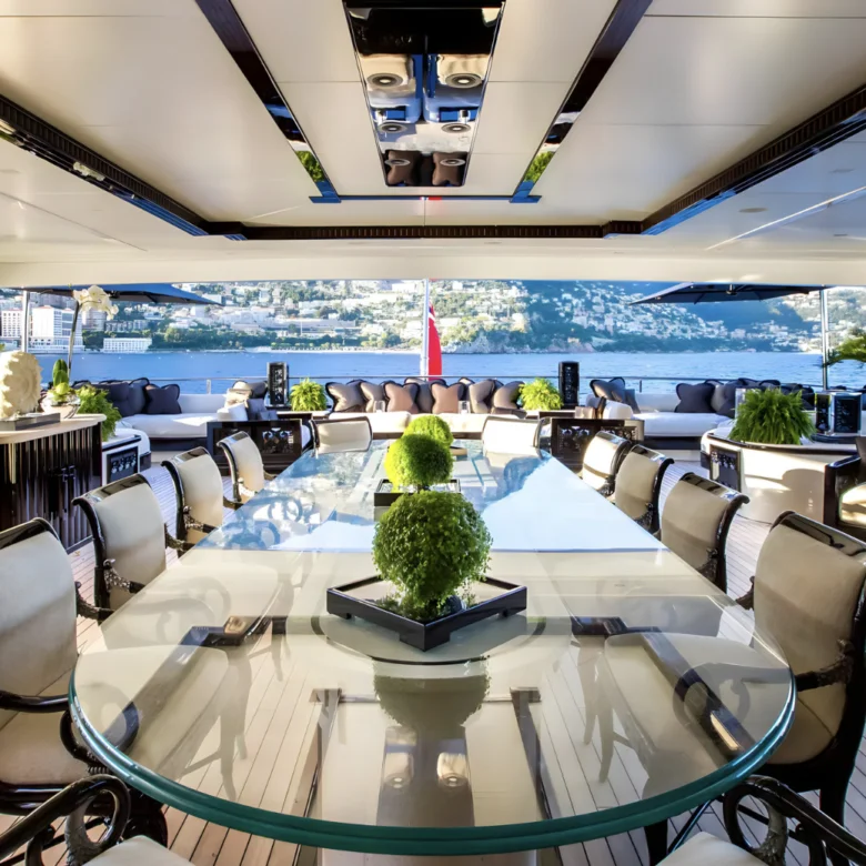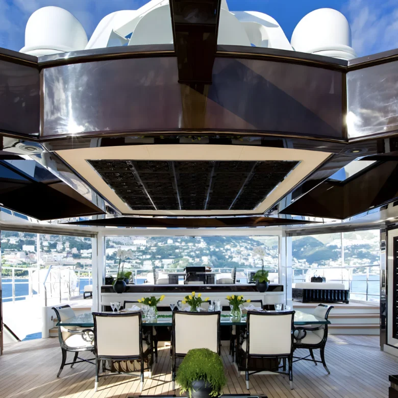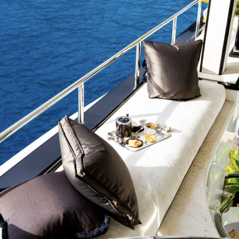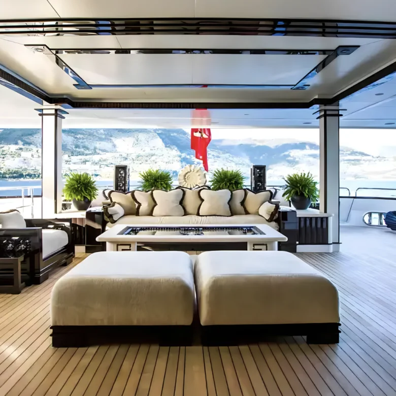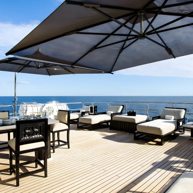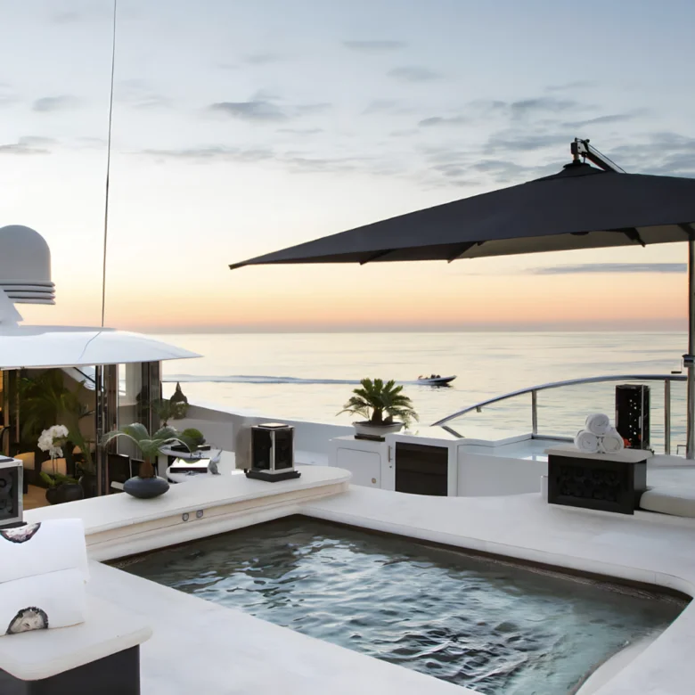 Teknede güneşlenme güvertesi, jacuzzi, geniş yüzme platformu ve oturma alanları yer almaktadır.